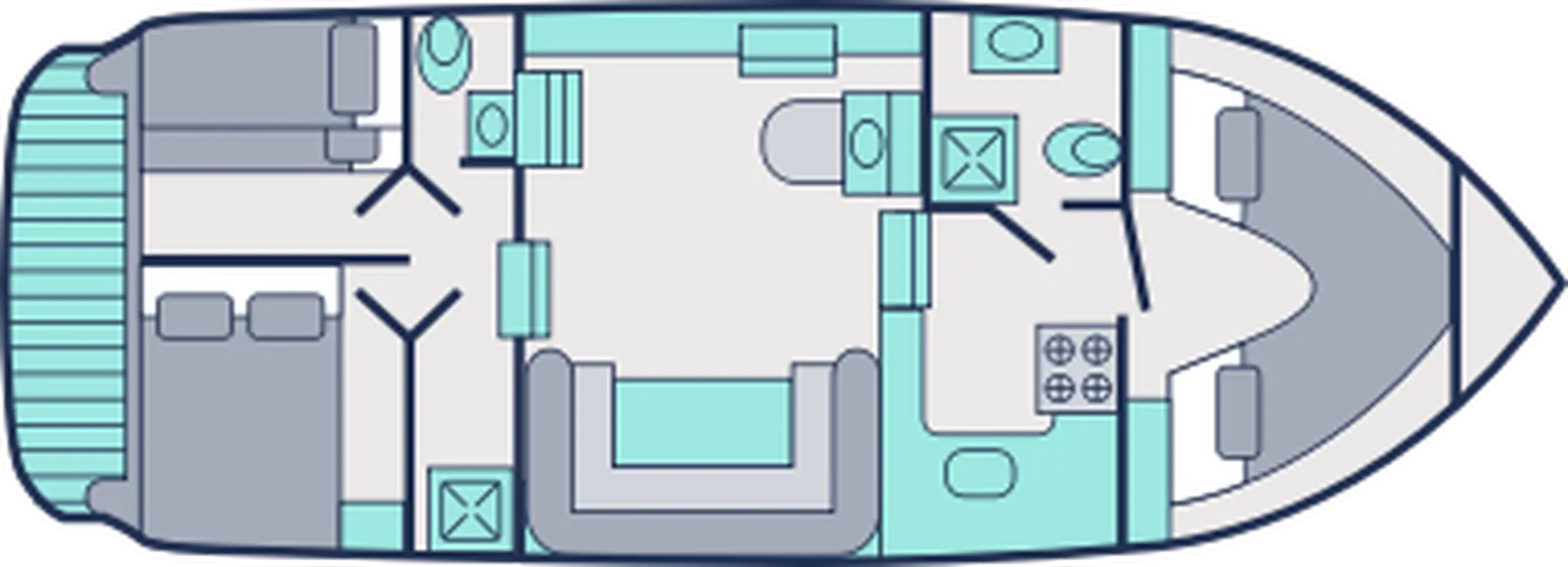Grosszügiges Boot mit Doppelkabine (umwandelbar in zwei Einzelbetten) im Bug, 2 Kabinen im Heck – eine mit Doppelbett und eine mit Kajütenbetten. Eine Nasszelle mit kombinierter Dusche/WC und separate Dusche und separates WC. Grosszügiger Salon (umwandelbar in Doppelbett), mit Radio/CD-Spieler, Steuerstand und Küche. Grosses Achterdeck mit zweitem Steuerstand und Klappverdeck. Das Bugstrahlruder vereinfacht die Handhabung des Schiffes.