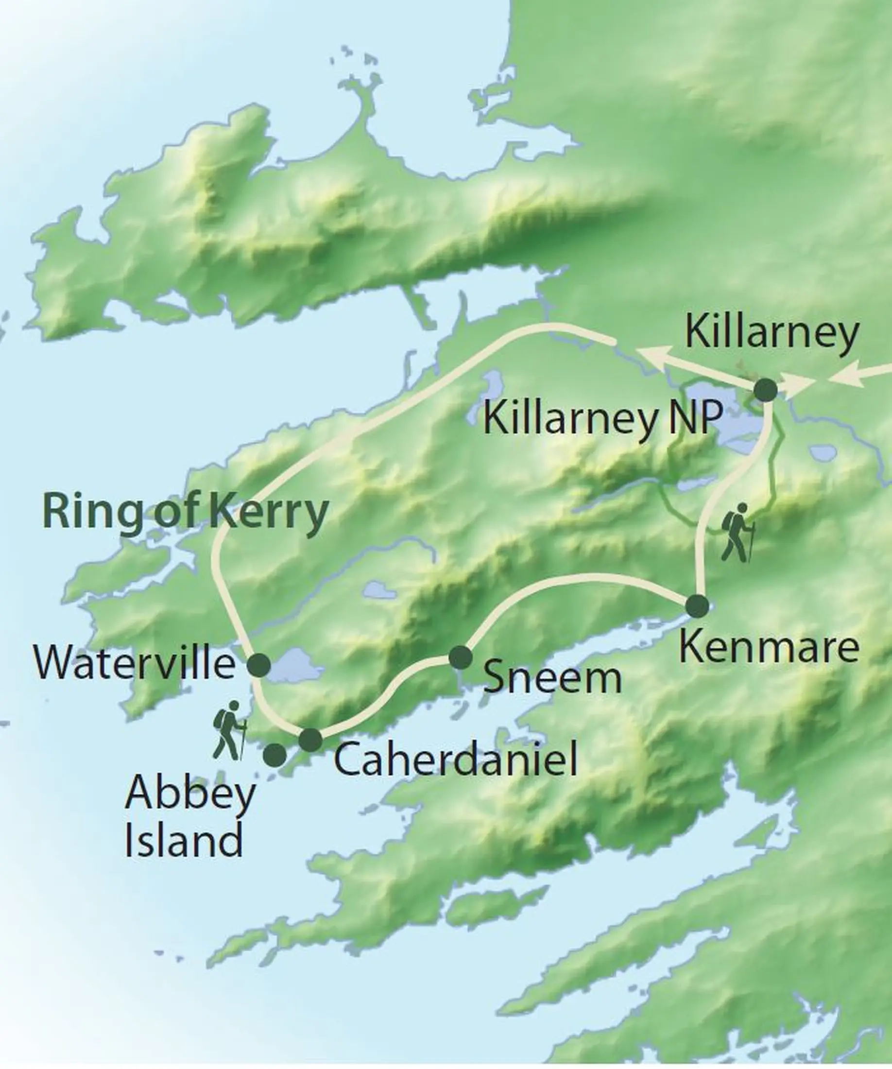 Freier Tag in Sneem mit einer Auswahl an Rundwanderungen in den Ausläufern der «Macgillycuddy’s Reeks», einem Gebirgszug mit dem höchsten Berg Irlands, dem «Carrantuohill» mit 1039 m. (je nach Rundwanderweg ca. 10–15 km, 3–5 h) Übernachtung wie am Vortag.