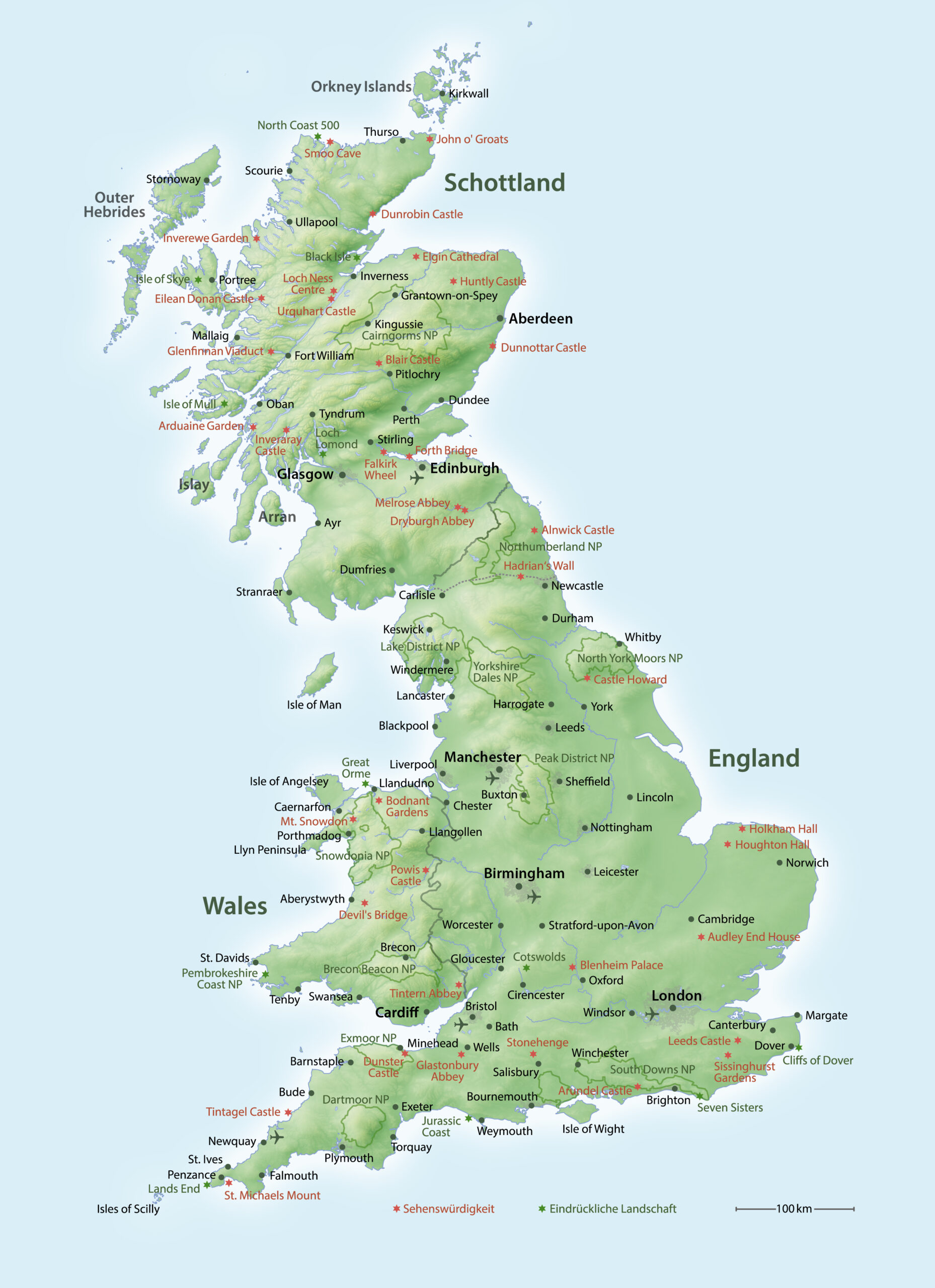 Unterwegs in England, Schottland und Wales kann man ganz Unterschiedliches sehen, erleben, geniessen. Viele tausend Meilen Küste laden zum (kühlen) Bad, Surfen, Picknicken, Spazieren und Wandern ein. Grossartige Naturerlebnisse bieten auch die Seen- und Berglandschaften in den Nationalparks. Einige Regionen bezaubern mit schmucken Dörfern und einer lieblichen Hügellandschaft, während andere mit ihrer Rauheit und Unberührtheit faszinieren. Ein „Schlaraffenland“ ist Grossbritannien auch für alle, die Freude an Geschichte, Kultur und Architektur haben. Die lange und bewegte Geschichte hat überall vielfältige Zeugnisse hinterlassen: Megalithen aus der Steinzeit, Burgen, Kathedralen und Klosterruinen aus dem Mittelalter, Herrenhäuser inmitten weitläufiger Park- und Gartenanlagen aus der Neuzeit. Der Hadrianswall am Nordrand Englands erinnert daran, dass Britannien einst Teil des Römischen Reichs war. In York oder Chester lassen Kathedrale, Stadtmauern und Altstadt erahnen, wie es im Mittelalter gewesen sein könnte. Einmalig schön sind die Universitätsstädte Oxford und Cambridge mit ihren geschichtsträchtigen Colleges. Zeitgenössische Architektur findet sich vor allem in den pulsierenden Städten, natürlich in London, aber auch in den sich neu erfindenden ehemaligen Industriestädten wie Manchester, Glasgow oder Cardiff.